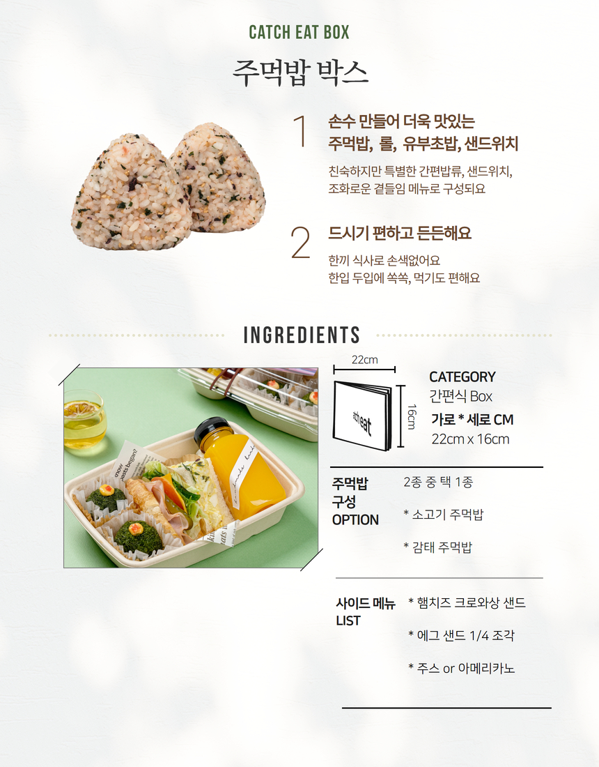 눈도 입도 즐거운 주먹밥과 샌드위치2종&음료가 사이드로 구성된 1만원대 예산에 추천드리는 도시락입니다.