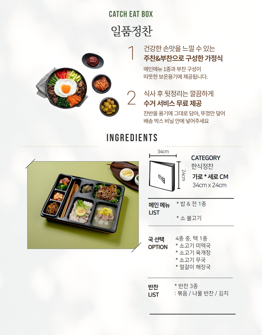 메인으로 소불고기와, 국 4종 중 1 선택 가능하며, 1만원대 예산에 추천 드리는 도시락입니다.