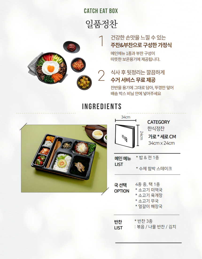 메인으로 수제 함박스테이크와, 국 4종 중 1 선택 가능하며, 1만원대 예산에 추천 드리는 도시락입니다.
