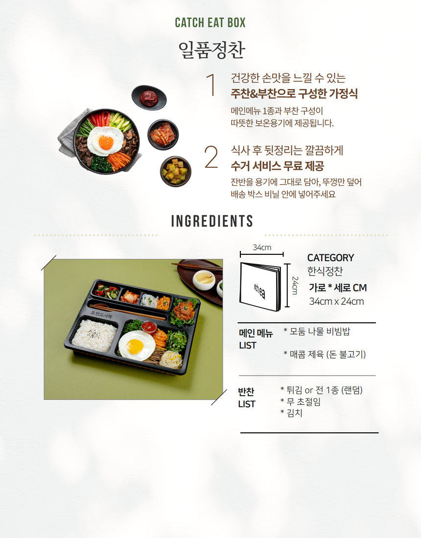 산뜻한 모둠 나물 비빔밥과 매콤 제육(돈 불고기)으로 구성된 1만원대 예산에 추천 드리는 도시락입니다.