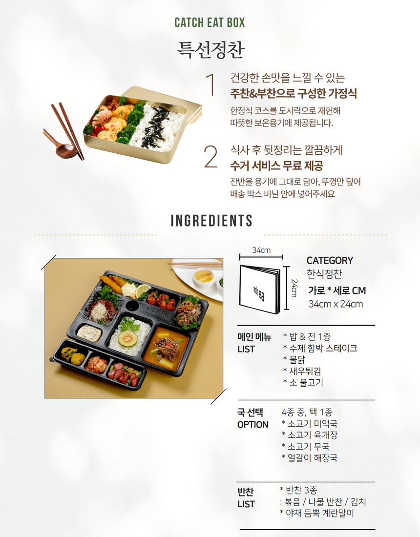 수제 함박 스테이크와 메인메뉴3종 & 곁들이기 좋은 반찬과 국 4종 (중 1 선택 가능)으로 구성된 2만 원대 예산에 추천드리는 도시락입니다.