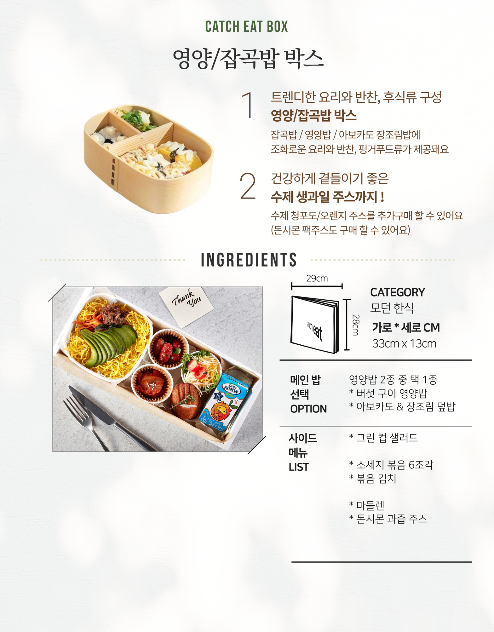 영양 가득 메인 밥 2종 선택 가능하며, 간단하게 곁들이기 좋은 반찬과 샐러드 간단한 디저트와 음료로 구성된 1만 원대 예산에 추천드리는 도시락입니다.