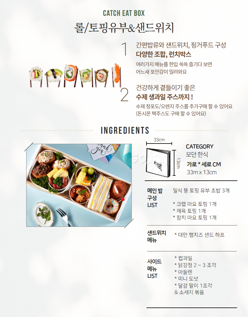 일식 토핑이 올라간 유부초밥과 샌드위치, 사이드 6종으로 구성된 1만 원대 예산에 추천드리는 도시락입니다.