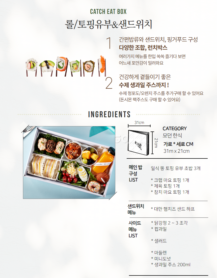 일식 유부초밥&샌드위치 달콤한 사이드 5종과 생과일 주스로 구성된 2만 원대 예산에 추천드리는 도시락입니다.