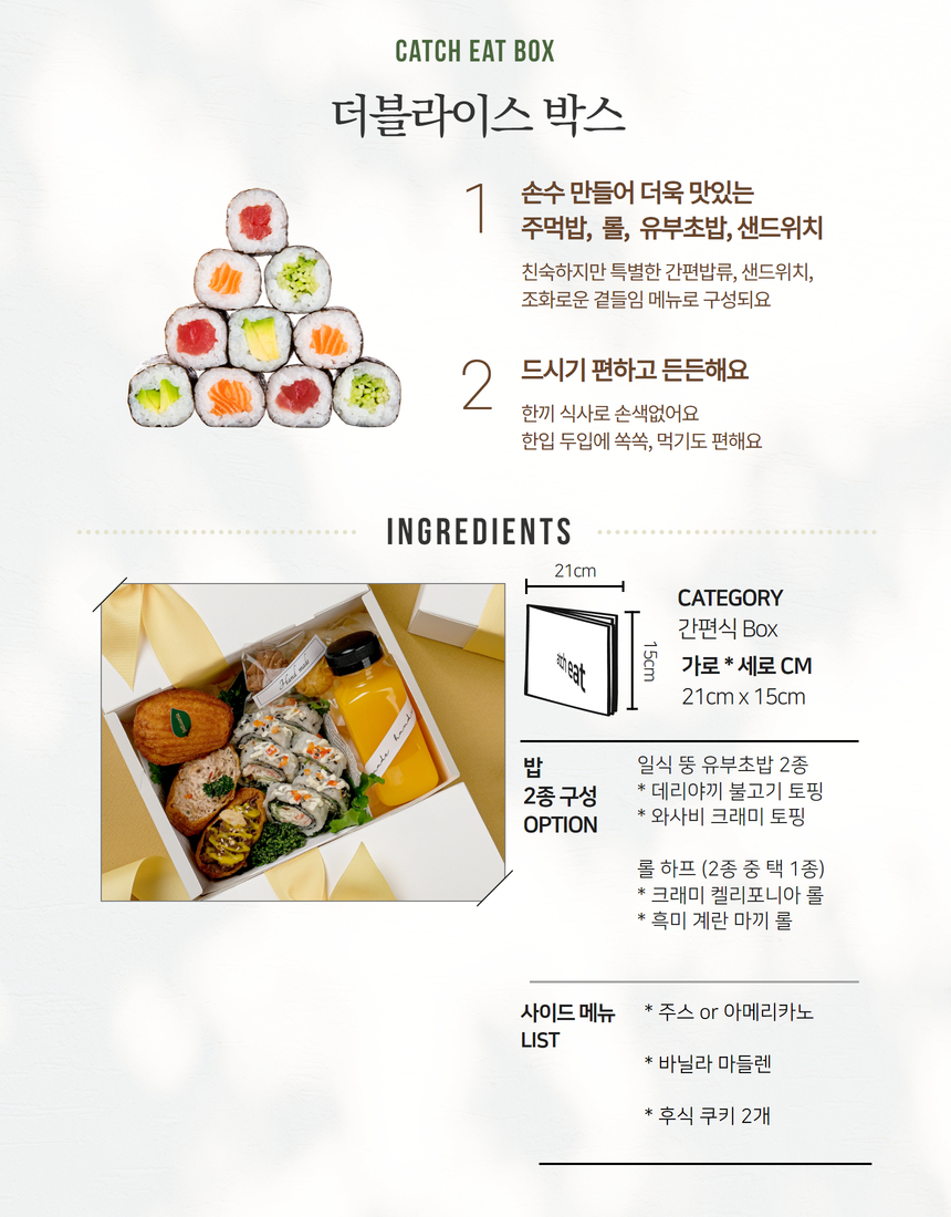 토핑가득 유부초밥과 먹기 편하고 맛있는 롤 ,달콤한 디져트로 구성된 1만 원대 예산에 추천드리는 도시락입니다.
