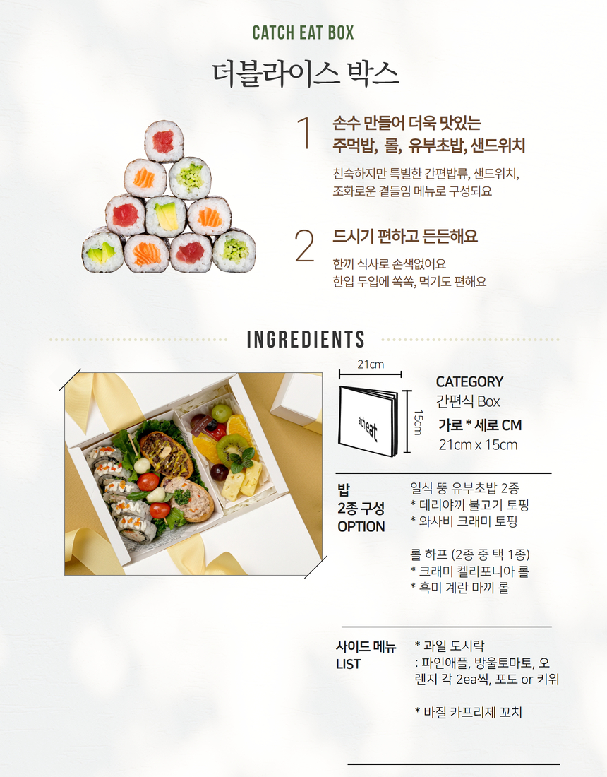 토핑가득 유부초밥과 먹기 편하고 맛있는 롤 ,신선한 제철과일로 구성된 1만 원대 예산에 추천드리는 도시락입니다.