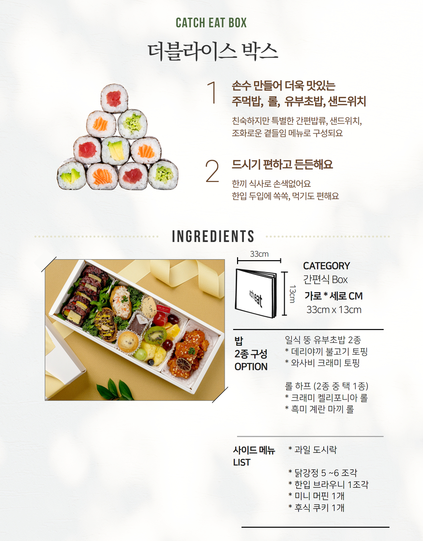 토핑가득 유부초밥과 먹기 편하고 맛있는 롤 ,달콤한 닭강정과 과일,쿠키디저트로 구성된 2만 원대 예산에 추천드리는 도시락입니다.