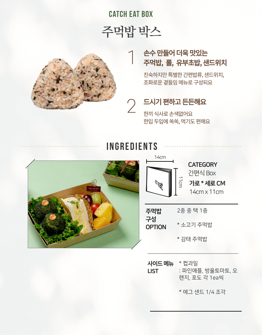 눈도 입도 즐거운 주먹밥과 에그샌드위치&컵과일이 사이드로 구성된 1만원대 이하 예산에 추천드리는 도시락입니다.