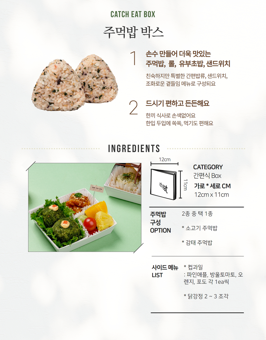 눈도 입도 즐거운 주먹밥과 달콤한 닭강정&컵과일이 사이드로 구성된 1만원대 이하 예산에 추천드리는 도시락입니다.