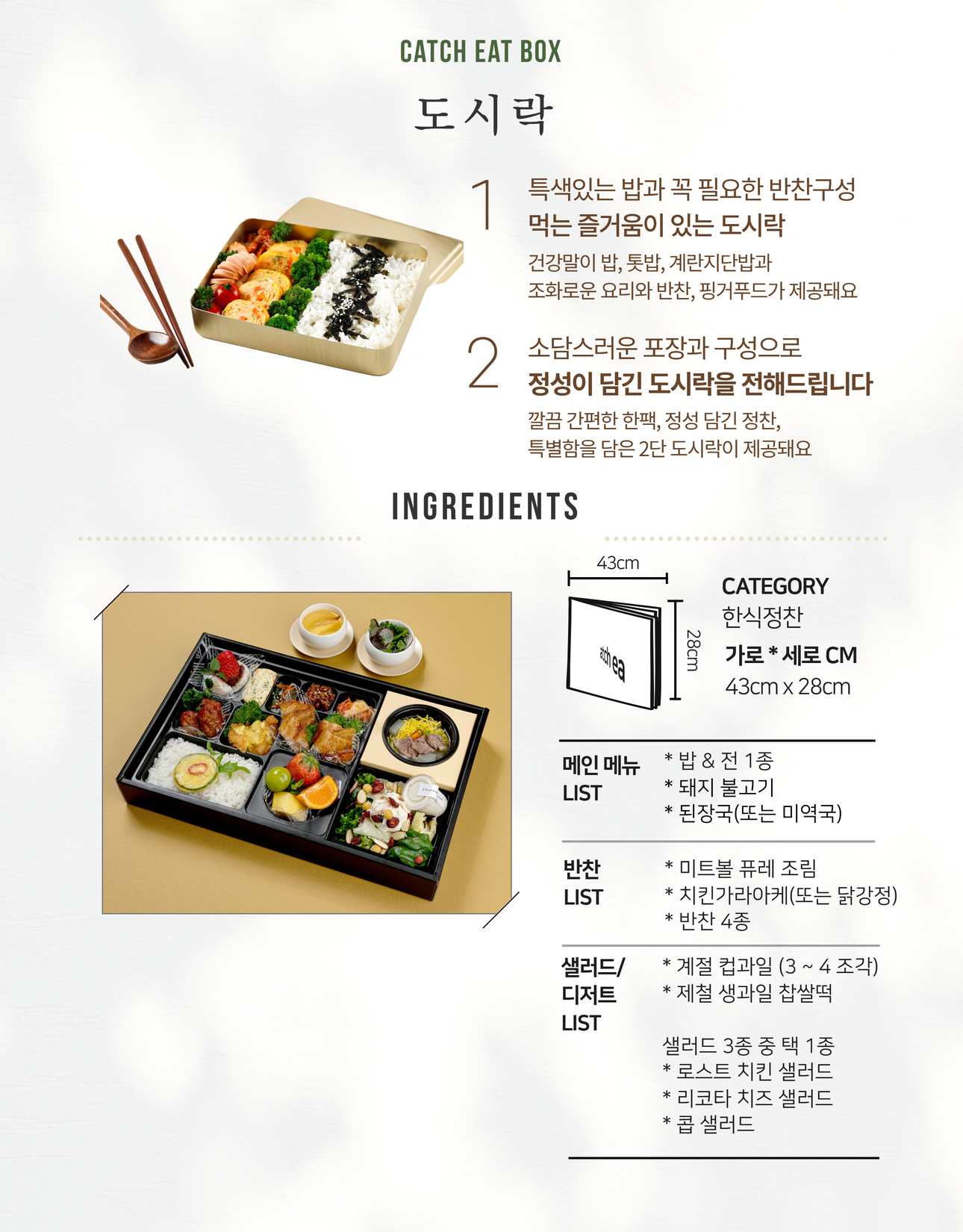 메인 1종과 기본 반찬 4종 및 사이드 &디저트 구성된 2만원대 예산에 추천 드리는 도시락입니다.